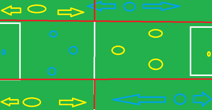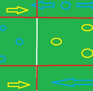 Die Spieler in der zentralen Zone spielen unter normalen Druckbedingungen, sie müssen das Spiel aufbauen und können die Flügelspieler anspielen, die in den unangreifbaren Außenzonen stehen.